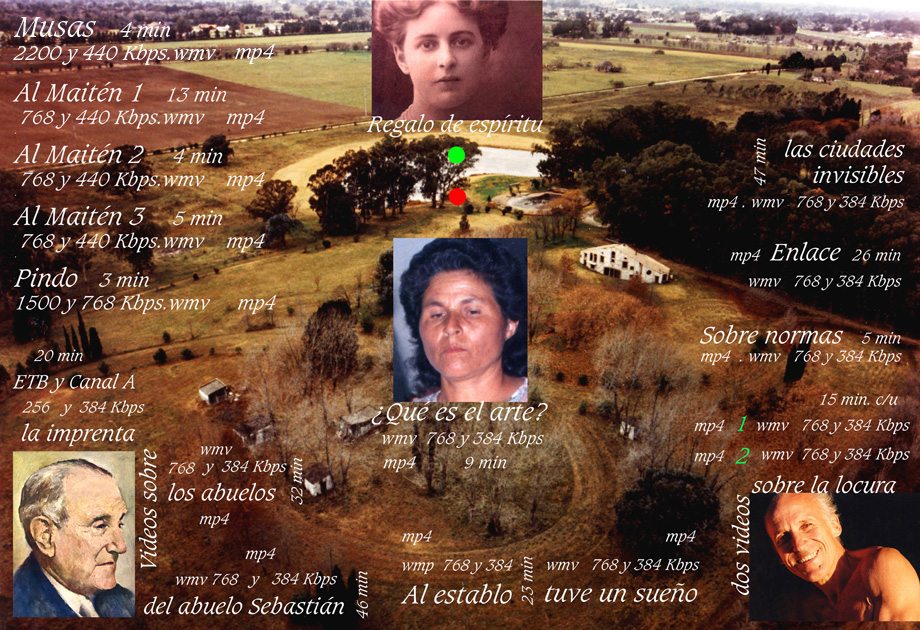 Videos sobre los abuelos; la imprenta familiar; los ámbitos de contención de la locura y la armonización de la esquizofrenia; criterios sobre normas; comentarios a una tesis sobre lo urbano y lo intangible rural; el enlace de sus autores; el terruño; las hebras de un sueño; constitución del habitat, paisaje construído a lo largo de 150 años; reflejos miméticos atesorados en un establo.